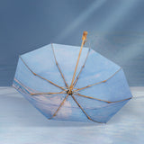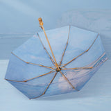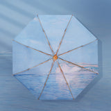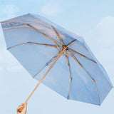 モネの『ディエップ近くのプールヴィルの干潮』を描いた晴雨兼用の折りたたみ傘。海に面する断崖のあるダイナミックな地形。青い海と空に向かって開かれた高台の風景が見事に描かれています。生地は日差しを遮ってくれる二層構造となっています。日差しの強い日も、雨の日もお使いいただけます。アートな柄が暑い日も、雨の日も気分をあげてくれる。