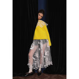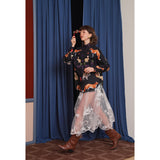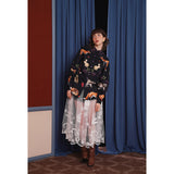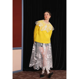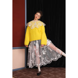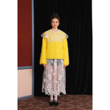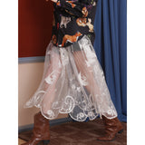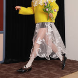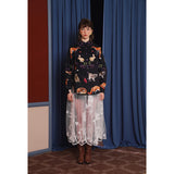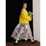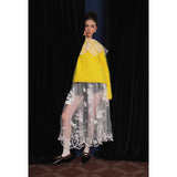 優雅に空を舞う白鳩や、美しい花々を刺繍したレースのチュールスカート。透明感溢れる軽やかでエレガントな印象を与えます。裾部分のスカラップデザインがフェミニンな雰囲気を強調し、動くたびに優雅な揺れを演出します。