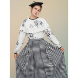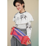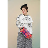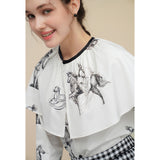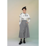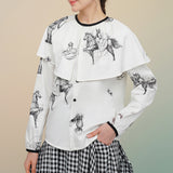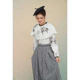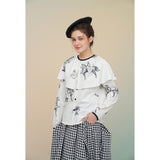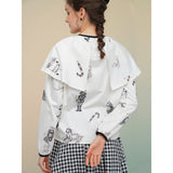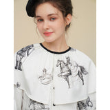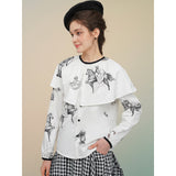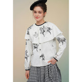 くるみ割り人形を贈られた少女が、人形と共におとぎの国へと旅をする”くるみ割り人形”の世界を鉛筆で描いたブラウス。肩から広がる大きめのケープカラーがエレガントな雰囲気を演出してくれる。おもちゃの兵隊たちとの勇敢な戦いを経て、王子となったくるみ割り人形。ロマンティックなファンタジーの世界に誘われてみて。