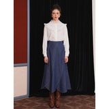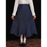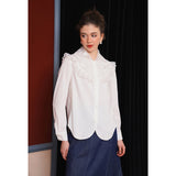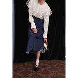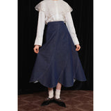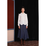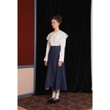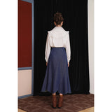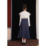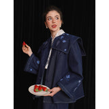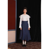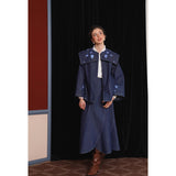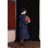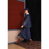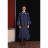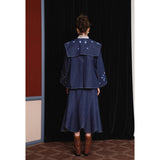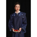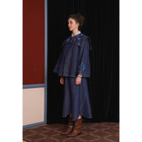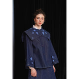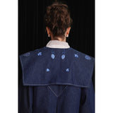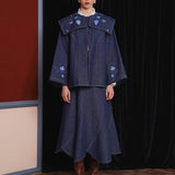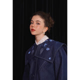 陽の光を浴びて輝く宝石のようなベリーの実を刺繍したデニムジャケットとデニムスカート。ジャケットは、大きなセーラーカラーが特徴的で、ベリーの実や葉っぱなどが刺繍されています。スカートは、裾部分がスカラップカットになっており、カジュアルなデニムでありながらフェミニンな雰囲気を演出してくれる。ウエスト部分はすっきりとしたデザインで、トップスをインして着ることで洗練されたスタイルに仕上がります。