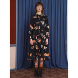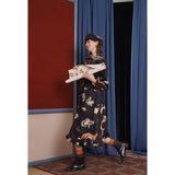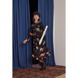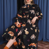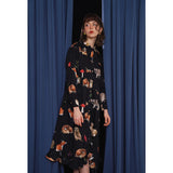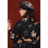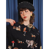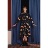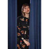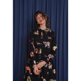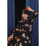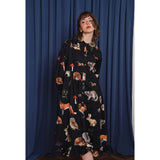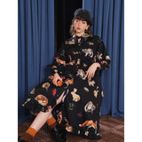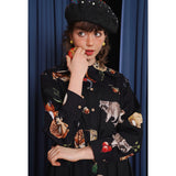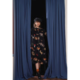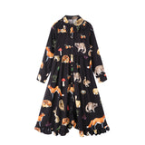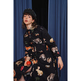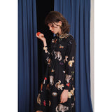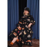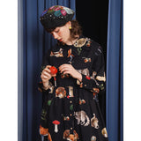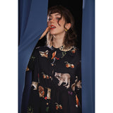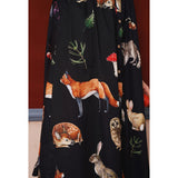 森の楽園の動物たちを筆致に描いたワンピース。キツネやウサギ、フクロウ、シカ、アライグマなどの動物たちがリアルなタッチで描かれ、まるで絵画のような美しさを持っています。燃えるように赤く、ふかふかとしたキノコや、宝石のような輝きを放つ木の実も描かれています。