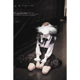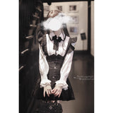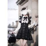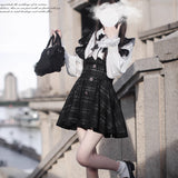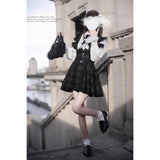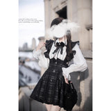 マットな黒のチェック柄を基調とし、シックな配色と肩紐のフリルが織りなす退廃的な可愛さが魅力のジャンパースカートとブラウス。ジャンパースカートは立体感あるタック入りで、優雅な広がりがあります。ブラウスはパフスリーブで袖口にはレースが施され、少女らしさを演出しています。落ち着きと少女らしさを絶妙に両立させたアイテム。