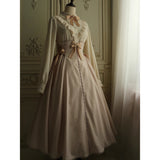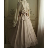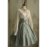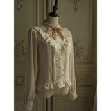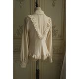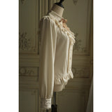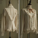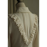 朝の訪れを見守る朝霧。そんな夜と朝を混ぜ合わせたような柔らかな色合いが特徴的なブラウス。フロントと背面には繊細なレースやフリルがあしらわれ、上品さを強調しています。背中のV字のレース装飾が存在感たっぷり。ウエスト部分にかけて軽く絞られており、フェミニンなラインを演出しています。