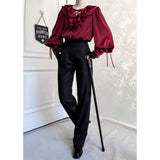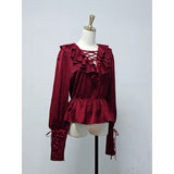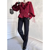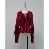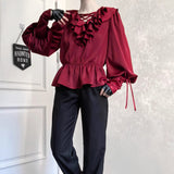 胸元にレースアップが施された深いVネックに、重なり合うフリルが立体的な存在感を生み出しているブラウス。柔らかな光沢を湛えた生地がウエストで静かに切り替わり、ほのかに広がるペプラムと、手首に向かって細く結ばれる長い袖が、甘さと緊張感を同時に宿しています。