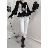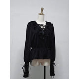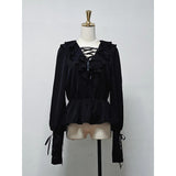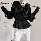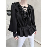 胸元にレースアップが施された深いVネックに、重なり合うフリルが立体的な存在感を生み出しているブラウス。柔らかな光沢を湛えた生地がウエストで静かに切り替わり、ほのかに広がるペプラムと、手首に向かって細く結ばれる長い袖が、甘さと緊張感を同時に宿しています。