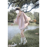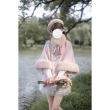 雪の国の妖精が纏うような、淡い夢色のケープコート。やわらかなピンクに包まれたシルエットは、首元と袖を飾るファーがふんわりと温もりを添えています。首元のリボンタイと繊細なブローチが、少女らしい純潔と優雅さを引き立て、まるで白い息とともに甘い魔法が舞い降りるよう。凍てつく空気の中でも心まであたためてくれる、ロマンティックなコート。