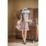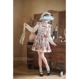 絵本の世界に迷い込んだような世界観のワンピース。赤・青のアクセントが効いたヴィンテージ調のプリントが施されたジャンパースカートとブラウスを組み合わせたアイテム。レトロで可愛らしいイラストが描かれており、異なる柄を組み合わせたパッチワークデザインが、どこかノスタルジックで新鮮。胸元のリボンやギャザー、裾のアイレットレースが甘さを添えつつ、立体的なシルエットで子供っぽくなりすぎない上品さも演出しています。