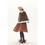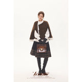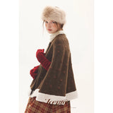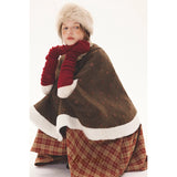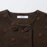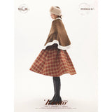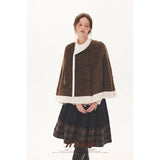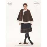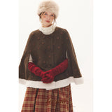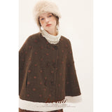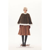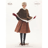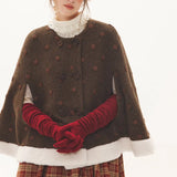 深みのあるブラウンを基調に、控えめなドットが織り込まれたケープコート。身体を包み込むように広がる柔らかなケープシルエットが印象的。裾部分にはふっくらとした白いボアがあしらわれることで、冬の空気をやさしく遮りながらもどこか童話的な雰囲気を醸し出しています。落ち着きと可憐さが同時に漂う一着。