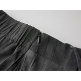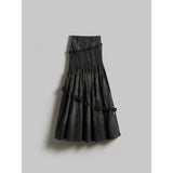 静謐でありながらどこか退廃的な空気を纏ったロングスカート。墨を含ませた布が静かに陰影を広げるようなグレートーンのアイテム。ウエストからヒップにかけては細やかなシャーリングが身体に寄り添い、そこから裾へと段階的に切り替えられたフレアとフリルが重力に従って深く揺れ落ちます。ところどころに走る縦のシワ感と柔らかなドレープが時間の経過を映し込むように表情を変え、装飾性を抑えた色味の中で構築的なレイヤーと陰影が際立っています。