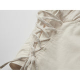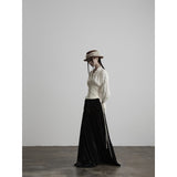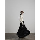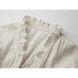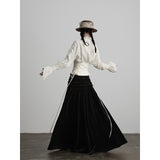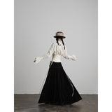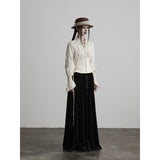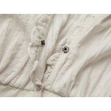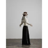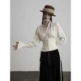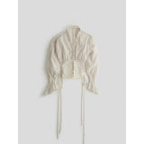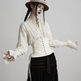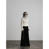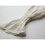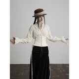 ロマンと退廃的な気配を漂わせるブラウス。胸元にやわらかなギャザーを寄せた生成り色のアイテムは、透け感のある繊細な生地が空気を含むように揺れ、深めに開いたフロントと細やかなボタンが縦のラインを際立たせます。ウエストにはコルセットのように身体に沿う切り替えが施されることで中世的な緊張感を宿しています。