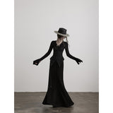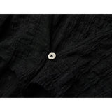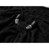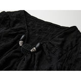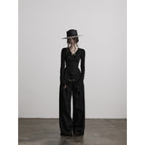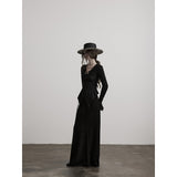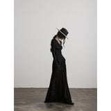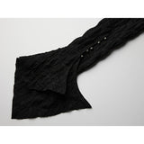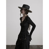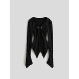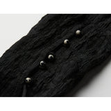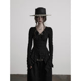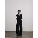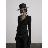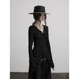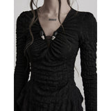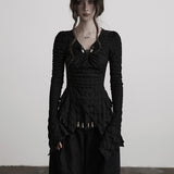 黒を基調に、全体に寄せられた細かなシャーリングが陰影を刻み、身体に沿って立体的にうねるようなシルエットを描き出すトップス。深めのVネックには小さな装飾金具が静かなアクセントとして配され、裾は不規則に揺れるアシンメトリーなラインを描きながら、長めの袖先が指先にかかることで、どこか退廃的で詩的な佇まいを纏わせています。