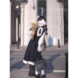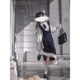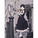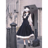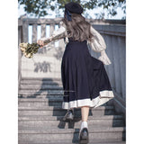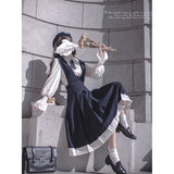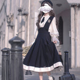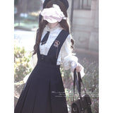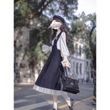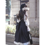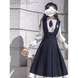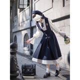 格調高き文学少女みたいに演出してくれる紺青色のジャンパースカートとブラウス。ジャンパースカートはウエスト位置が高く、裾部分にはプリーツがかかり、刺繍が装飾されています。ブラウスは袖口が長く、レース刺繍が装飾されており、優雅な印象を与えてくれる。