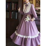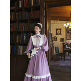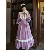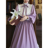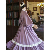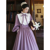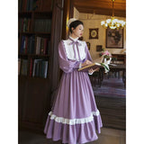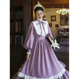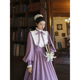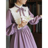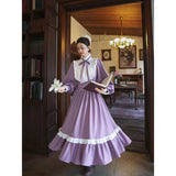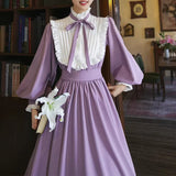 本棚に囲まれた静かな書庫で、百合の花と一冊の本を手に、物語の世界へと想いを巡らせる少女の姿を思わせるような、知的でロマンティックな雰囲気を纏ったワンピース。柔らかなラベンダー色の生地は、窓辺に差し込む午後の光に包まれた花のように穏やかな色合いを帯び、落ち着きの中にやさしいロマンを感じさせます。胸元には細かなプリーツとフリルが整然とあしらわれ、中央で結ばれたリボンが、古い詩集に添えられた栞のように上品なアクセントを添えています。ハイネックのフリルカラーや袖口の小さなパールボタンは、古典的なドレスの気品を思わせ、ふんわりとした袖と広がるスカートが、歩くたびに静かな優雅さを描きます。裾に施されたフリルのラインは、ページをめくるたびに広がる物語の余韻のようにやわらかく揺れます。