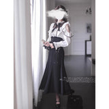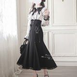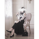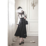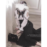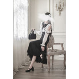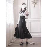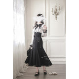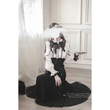 優雅さと可愛さを兼ね備えた令嬢のような、クラシカルな甘さを醸し出しているアイテム。フリルとレースを贅沢にあしらったトップスは、透け感のあるレースがエレガントな陰影を添え、肩を程よく見せるカッティングが華奢な印象を演出します。ロング丈のスカートは、流れるようなマーメイドシルエットに、しっかりとしたハードなコルセットを施したデザイン。裾部分にはレースが装飾されており、ロマンティックなムードを強調しています。