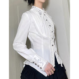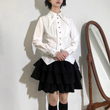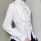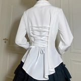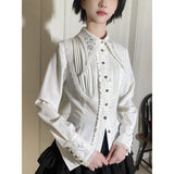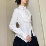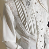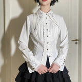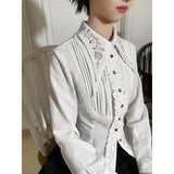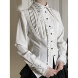 静かなる騎士を思わせる、毅然としながらもどこか叙情的なブラウス。胸元から裾へと続く細やかなプリーツとフリルの縦ラインが、まるで一本の剣筋のように毅然とした気配を描き、肩に向かって鋭角に広がる大きめの襟には薔薇と十字架の刺繍が施され、毅然とした優雅さを醸し出しています。袖口にはボタンと刺繍が並び、繊細なレースが指先の所作に静かな華やぎを与え、背面のコルセット編みがウエストラインを美しく引き締めながら、シルエット全体に緊張感のあるエレガンスを宿しています。