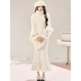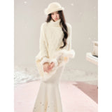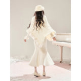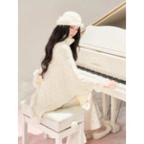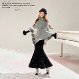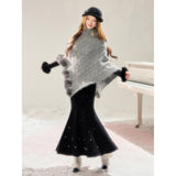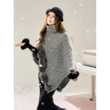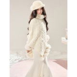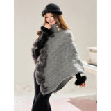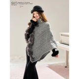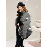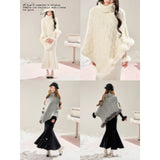 身体をふんわりと包み込むこのニットショールは、立体的なケーブル編みが描く優しい曲線と、端を彩るふわふわのファートリムが冬のロマンチックなムードをそのまま形にしたような一着。肩から斜めにかかるアシンメトリーなデザインが美しいドレープを生み、歩くたびに軽やかに揺れてエレガントなシルエットを演出します。首元は暖かなハイネックで、上品なボタンがさりげないアクセントとなり、全体の品格をさらに引き立てています。