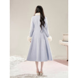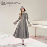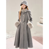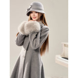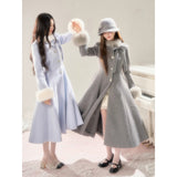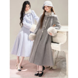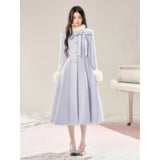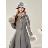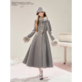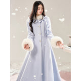 雪のように澄んだ光に包まれた世界で佇むこのファーコート。柔らかく広がるロング丈のシルエットが歩くたびにふわりと揺れ、上品で静かなドラマを描き出します。首元にはふわふわとしたファーが添えられ、まるで息が触れれば溶けてしまいそうなほど繊細で、冬の吐息そのもののよう。胸元には輝くビジュー調ボタンが並び、光を受けて星の瞬きのようにきらめきます。大きく結ばれたリボンはコート全体の気品を高め、可憐さとクラシックなロマンをひとつに結びつけています。