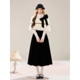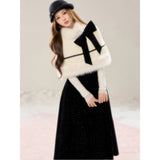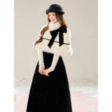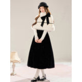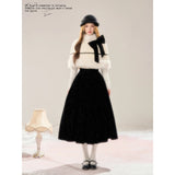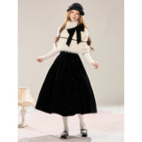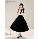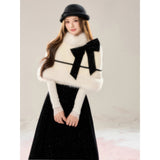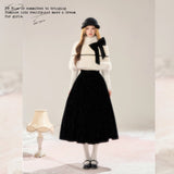冬の静謐さと少女らしい夢見心地を同時に宿した、ロマンティックで上品なケープとスカート。ケープは、なめらかなホワイトファーを贅沢にあしらい、首元から裾まで優雅に流れるシルエットが特徴です。大ぶりのベルベットリボンが視線を引き寄せ、クラシカルでありながら物語性を感じるアクセントになっています。スカートは、深い黒にきらめく微細なラメが散りばめられ、まるで星屑を纏ったような幻想的な印象。たっぷりと広がるフレアラインが優雅に揺れ動き、立っていても歩いていても絵画のような美しさを保ちます。