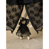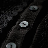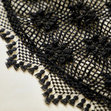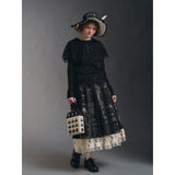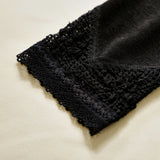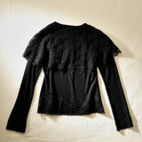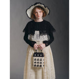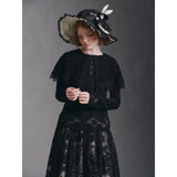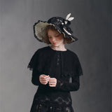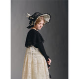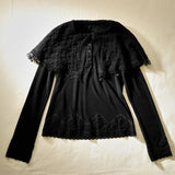 古い物語の挿絵から抜け出したかのような、慎ましくも詩的な佇まいを感じさせるケープニットトップス。繊細なレース編みのケープを肩にそっと重ねたようなアイテム。身頃はしなやかに身体に沿う薄手のニット素材、そこに透け感のあるクロシェレースが短丈のケープとしてあしらわれ、静かな陰影を生み出しています。