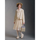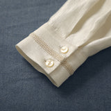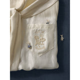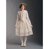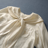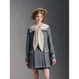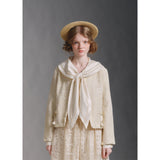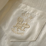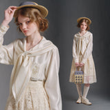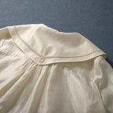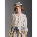 まるで静かな午後のカフェでページをめくるような、清楚で詩的な空気を纏ったセーラーブラウス。胸元にはドールハウスにあるような机と椅子が刺繍されており、そっと物語を添えています。やわらかな光を含んだアイボリーの生地が静かに揺れ、前後で美しく角度を描く襟のラインは後ろ姿まで品よく整え、控えめなボタンや袖口の仕立てがクラシカルな余韻を残します。