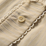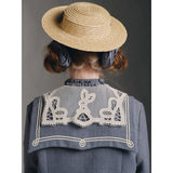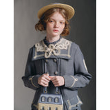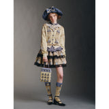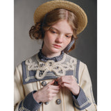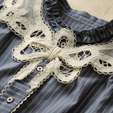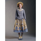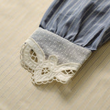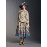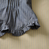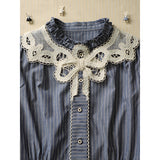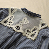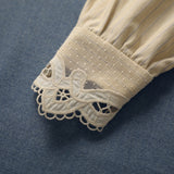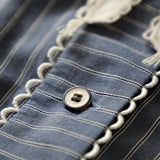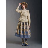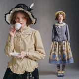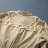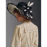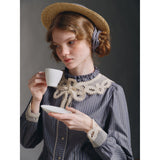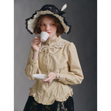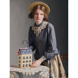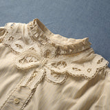 ノスタルジックな空気を纏った、慎ましくも詩的なブラウス。首元には繊細なレースで描かれた大きなリボンモチーフが配され、装飾でありながら主張しすぎず、古い絵本の挿絵に添えられた飾り罫のような品の良さを漂わせています。前立てや袖口、裾には細やかなフリルとピンタックが丁寧に重ねられ、動くたびにほのかな陰影を生み、背中にも透け感のあるレースヨークがあしらわれることで、後ろ姿まで物語を感じさせます。