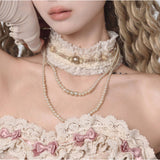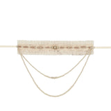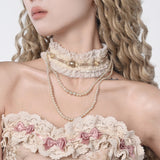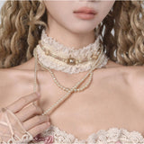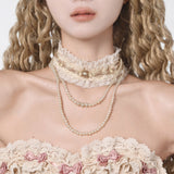王妃みたいに演出してくれるロマンティックで詩的なチョーカー。生成りの繊細なレースを幾重にも重ね、首元にそっと巻かれるように仕立てられたアイテム。柔らかなフリルが肌に溶け込むように波打ち、その中央には控えめな光を宿すパールと淡いゴールドのビーズが静かに並びます。レースの縁に施された細かな透かし模様は、古い下着や室内装飾の名残を思わせ、そこから垂れる二連、三連のパールネックレスが鎖骨の上に優雅な弧を描きます。