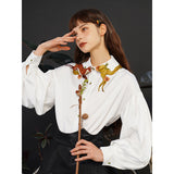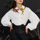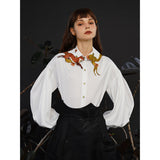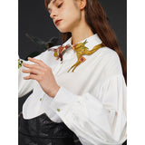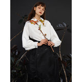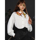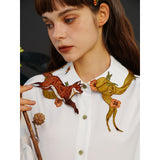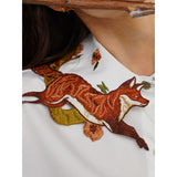 花に遊ぶ狐の刺繍ブラウス - White