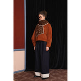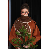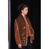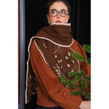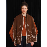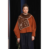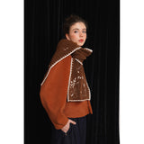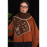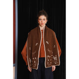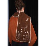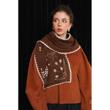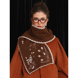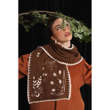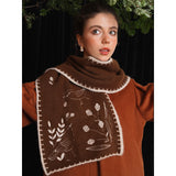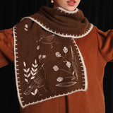季節の便りを運ぶ小鳥と、そよ風に揺れて踊る植物を刺繍したマフラー。互いの美しさを引き立てる調和の協奏曲。マフラーの縁には白地のステッチの装飾が施され、手仕事の温かみを感じさせるディテールになっています。