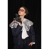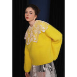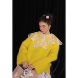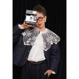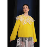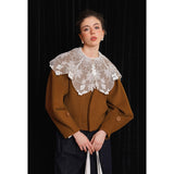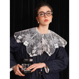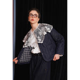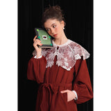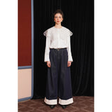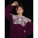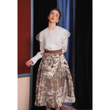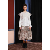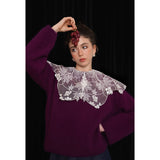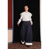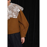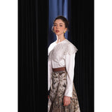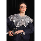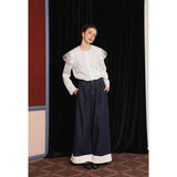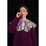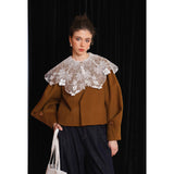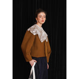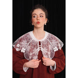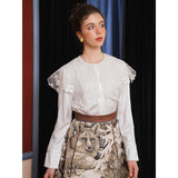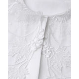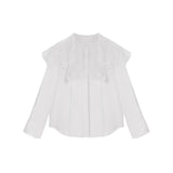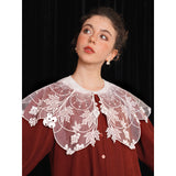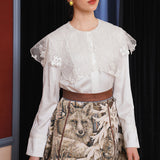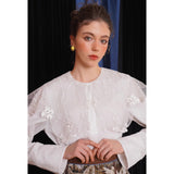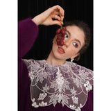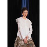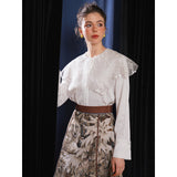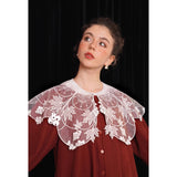 ホワイトカラーに美しい刺繍襟が施されたブラウス。襟部分には風に吹かれて舞う楓の葉や、小さな宝石のようなベリーの実をモチーフにした、透け感のあるチュール刺繍が施されています。袖口にも控えめなデザインのアクセントが加えられており、クラシカルでありながらもモダンな要素を感じさせます。