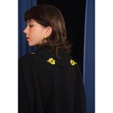 黄色いキンポウゲの花を刺繍したショート丈のブラウス。肩を落としたドロップショルダーとなっており、大きめの襟が特徴的。襟全体には、野原に小さな太陽を咲かせたような可憐で鮮やかな花が刺繍されています。