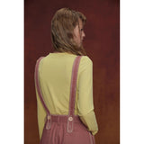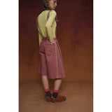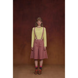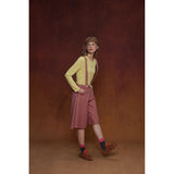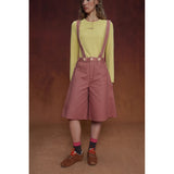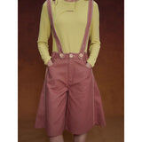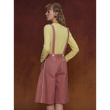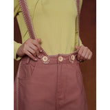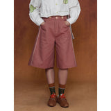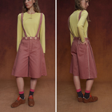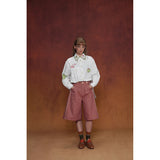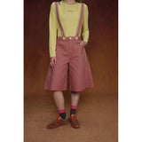 カジュアルさと遊び心を兼ね備えたデザインが特徴的なストラップパンツ。くすんだ煉瓦のようなカラーのハーフ丈パンツに、太めのストラップが前後に走り、ボタン留めで装飾的なアクセントを加えています。シルエットはワイドでゆったりとしており、サイドやストラップ部分に施されたジグザグのステッチが印象的。レトロなニュアンスを感じさせます。
