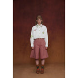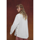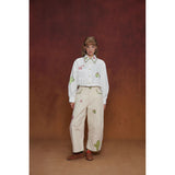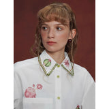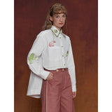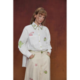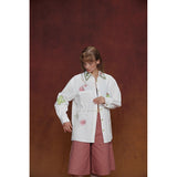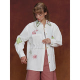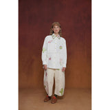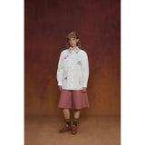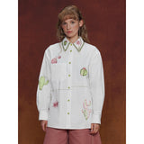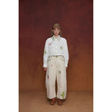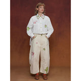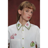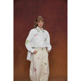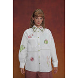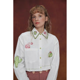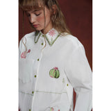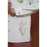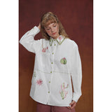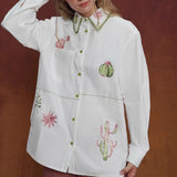 砂漠の大地で花をつけたサボテンを刺繍したブラウス。ホワイトの地にカラフルなサボテンや花の刺繍が散りばめられたデザイン。襟にも同じ刺繍が施されています。緑色のステッチが施され、遊び心とクラフト感が漂います。カジュアルながらも独自の個性を感じさせます。