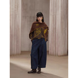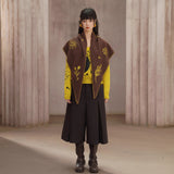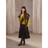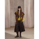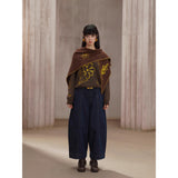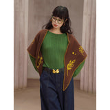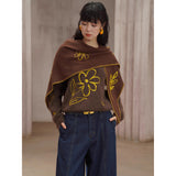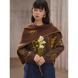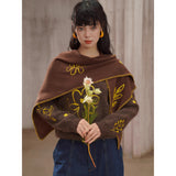 秋の庭園を思わせるあたたかな存在感を纏うウールマフラー。深みのあるチョコレートブラウンをベースに、手刺繍のような黄色の花と葉のモチーフが優しく浮かび上がり、ノスタルジックで詩的なムードを演出します。柔らかなウール素材が肩にふんわりと沿い、羽織るだけで穏やかな季節の気配を感じさせる仕上がり。