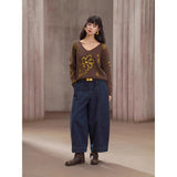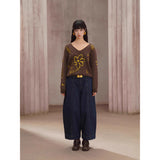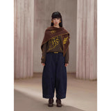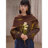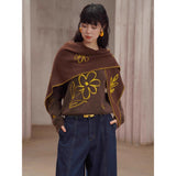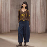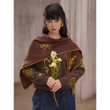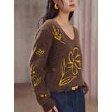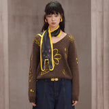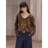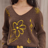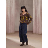 まるで秋の陽だまりをそのまま纏ったかのようなニットセーター。チョコレートブラウンのふんわりとした生地に、手刺繍のような黄色の花と葉のモチーフが優しく浮かび上がり、ノスタルジックで詩的なムードを演出します。深めのVネックがデコルテを美しく見せます。ナチュラルな可愛らしさとアートな個性が共存するアイテム。