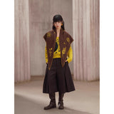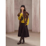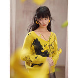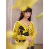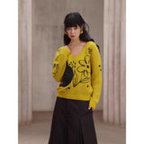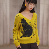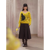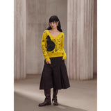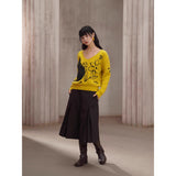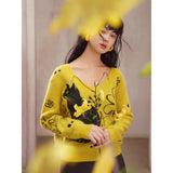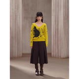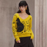 黒猫と花々が大胆に描かれたアートピースのようなニットセーター。マスタードイエローの温もりある色合いに、黒地の刺繍がくっきりと浮かび上がり、まるで絵本の1ページのような世界観を表現しています。深めのVネックが女性らしい抜け感を与えます。愛らしさと洗練が共存する、秋冬のスタイルを華やかに彩るアイテム。