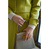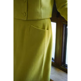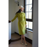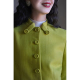 1950年代の映画女優を想起させるクラシックなジャケットとスカート。ジャケットは、控えめなラウンドカラーや襟部分と袖口の折り返しディテールが上品さを引き立て、ウエストラインを美しく見せる設計となっています。スカートは、シンプルながらもエレガントなシルエット。現代的なエレガンスを兼ね備えたアイテム。