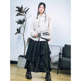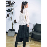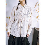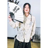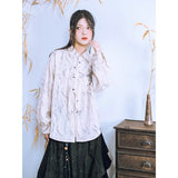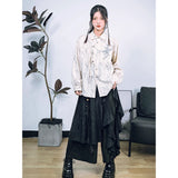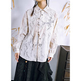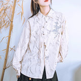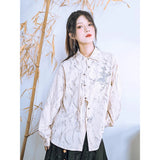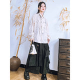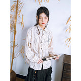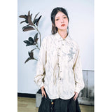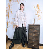 煌々と輝く月明かりのようなアイボリーの地に、木の枝に止まる鶴の刺繍を施したチャイナトップス。張り出した木の枝に止まって四方を眺め見渡す鶴。非対称な前立てが個性的で、ややゆとりのあるボックスシルエットが抜け感を演出してくれる。伝統的な意匠を現代的に落とし込んだ一枚。