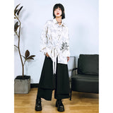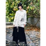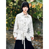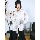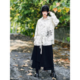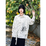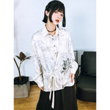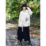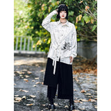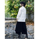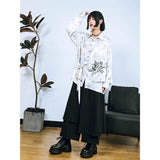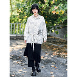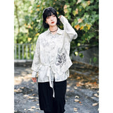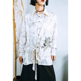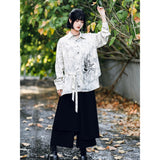 松の梢に留まった鶴を刺繍したブラウス。淡い墨絵のような滲みのあるテクスチャによって、静謐な美しさを表現しています。ややゆったりとしたシルエットに、片側を結ぶラップ風のデザインが加わり、動きに合わせて軽やかに揺れる印象を演出。シャツの端正さと羽織りのような柔らかさが調和した、モダンでありながら伝統を感じさせる一枚。