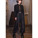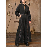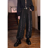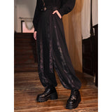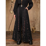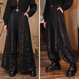 東方の神秘と暗黒の美を纏ったアートピースのようなワイドパンツ。ゆったりとしたドレープシルエットに、五毒──蛇、蟇、百足、蠍、蜥蜴──が静かに蠢くように描かれ、妖しげな生命の気配を漂わせます。深淵を思わせる黒の中に、古の呪術や護符を連想させる文様が浮かび上がり、身にまとう者の内なる力を呼び覚ますよう。静謐と毒気、二つの相反する美が交錯する、退廃的で詩的なデザイン。