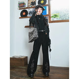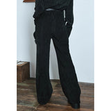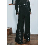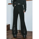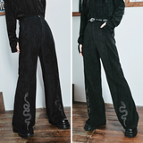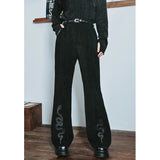 静寂の中に潜む危うさを纏うようなコーデュロイパンツ。黒の深みの中に、裾へと蠢くように描かれた蛇骨の刺繍が、死と再生の輪廻を象徴しています。繊細でありながら力強いその曲線は、闇の美学を体現するかのように脚線を際立たせ、静かに見る者を惹きつける。冷たく光る骨の意匠が、禁忌の美を語る、静謐で妖艶なブラックパンツ。