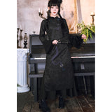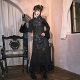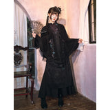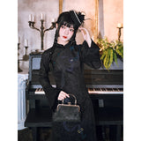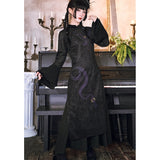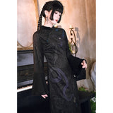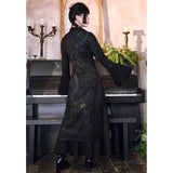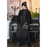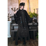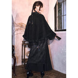闇に息づく神秘を纏うような刺繍ケープとチャイナワンピース。流麗な黒のシルエットに、五毒──蛇、蟇、百足、蠍、蜥蜴──が静かに描かれ、古の護符のような気配を放っています。ケープは重厚なコーデュロイに繊細な刺繍が施され、毒と美を共存させた儀式のヴェールのよう。ワンピースは妖気を帯びた光沢の中に、うねる蛇の文様が浮かび上がり、身体の動きに合わせて生命を得たように揺らめいています。幽玄と艶やかさが交差する、禁断の美を具現化したスタイル。
