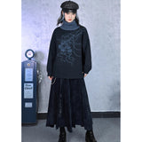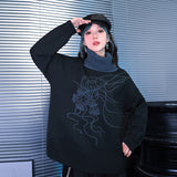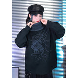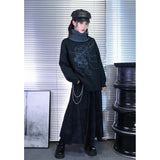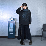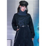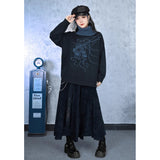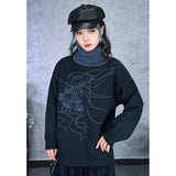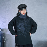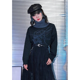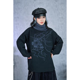 夜の静寂を思わせるような深いチャコールトーンに、繊細な線画で描かれたクラゲのモチーフが浮かぶタートルネックセーター。柔らかなニット地が肩を包み、ゆるやかなシルエットが落ち着いた佇まいを演出。首元のリブタートルは濃淡のあるブルーグレーで切り替えられ、全体に奥行きと詩的なニュアンスを添えています。海中を漂うような静かな動きを感じさせる、アートピースのようなアイテム。