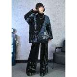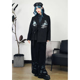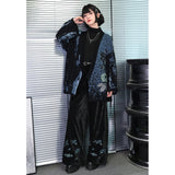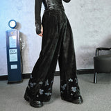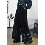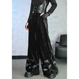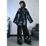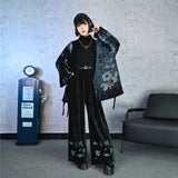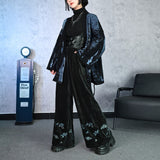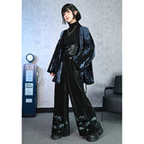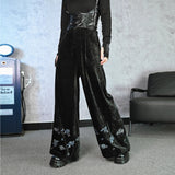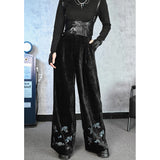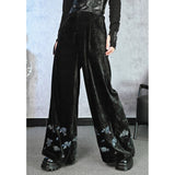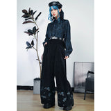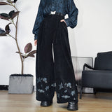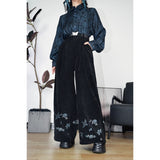 深い闇を思わせる漆黒のベロア地に、光を吸い込むような艶をまとったワイドパンツ。ゆったりと広がるワイドシルエットが、歩くたびに柔らかく波打ち、裾に施された椿の花と鶯の刺繍が静謐な詩情を添えています。ハイウエストの構築的なラインが腰の位置を美しく見せ、全体に気品と強さが共存するデザイン。夜の森を思わせるような神秘と静寂を纏う、アートのようなパンツ。