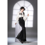 ワルツの旋律が甘美に響く貴族の舞踏会。美しき貴族のお嬢様みたいに演出してくれるロマンティックゴシックなブラウス。首元から胸元にかけて幾重にも重なるフリルが立体的な陰影を描き、中央にはきらりと輝くブローチが添えられて気品あるアクセントを放つ、まるで西洋の貴族服を思わせる優雅な一着。肩から袖にかけてはたっぷりとしたボリュームスリーブが流れるように広がり、肘下で再びフリルが揺れてドラマティックなシルエットを生み出しています。手元にはレースカフスがあしらわれて細部までクラシカルな世界観を貫きながらも、しなやかな落ち感のある生地が動きに合わせて柔らかく波打ち、甘さと凛とした強さを同時に感じさせています。