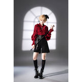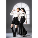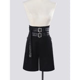 ワルツの旋律が甘美に響く貴族の舞踏会。美しき貴族のお嬢様みたいに演出してくれるハイウエストなハーフパンツ。膝上丈のすっきりとしたストレートシルエットが凛とした印象を与えながら、ウエスト部分に重ねられた二本のワイドベルトがコルセットのように腰回りを引き締めています。アンティーク調の装飾バックルがひときわ存在感を放ち、クラシカルでエッジの効いたデザインに仕上げられています。重厚さと洗練を両立させ、ゴシックな気配とモードな緊張感をまとった、装飾性と構築的な美しさが際立っています。