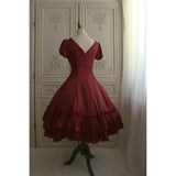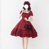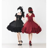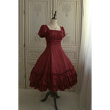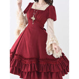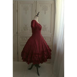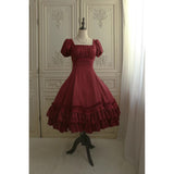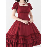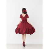 角度が変わると、まったく違う美しさを見せるクラシカルなワンピース。スクエアネックにギャザーを寄せた胸元と、ふんわりとしたパフスリーブが可憐さを演出し、ウエストから広がるたっぷりのフレアスカートは二重のフリルとレースで優美な表情を添えています。後ろ姿はすっきりとしたV字カットが施され、上品さの中に大人らしい魅力を漂わせるデザイン。まるでヴィクトリア時代の舞踏会を思わせるような、華やかで気品ある一着。