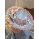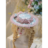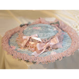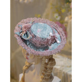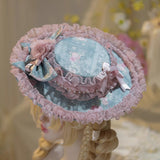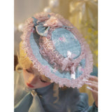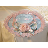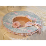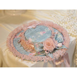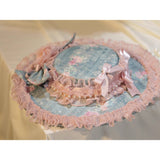 18世紀ロココ時代の宮廷貴婦人を思わせる優雅な世界。淡い水色のジャカード生地に繊細な花模様が織り込まれたロココ調の帽子。縁をぐるりと囲むくすみピンクのフリルとパールがあしらわれ、リボンと立体的な花飾りが咲き誇っています。優雅な甘さと夢見るような雰囲気を湛えています。