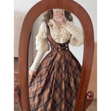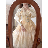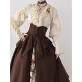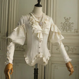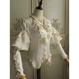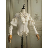 19世紀の貴族のサロンで静かに佇む令嬢の気品を讃えたブラウス。柔らかく波打つフロントのラッフルは、胸元で揺れる吐息を思わせ、滑らかに艶めく生地は、キャンドルの灯りに照らされた室内の空気をそのまま閉じ込めたかのよう。袖に重ねられたフリルと、手首にかけて連なるボタンのディテールは、ドレスコードに守られた時代の美意識と、厳格さの中に潜む繊細な装飾へのこだわりを象徴し、身体のラインに沿うシルエットは、控えめでありながらも確かな存在感を静かに主張します。