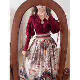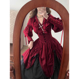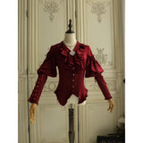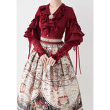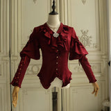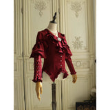 19世紀の貴族のサロンで静かに佇む令嬢の気品を讃えたブラウス。柔らかく波打つフロントのラッフルは、胸元で揺れる吐息を思わせ、滑らかに艶めく生地は、キャンドルの灯りに照らされた室内の空気をそのまま閉じ込めたかのよう。袖に重ねられたフリルと、手首にかけて連なるボタンのディテールは、ドレスコードに守られた時代の美意識と、厳格さの中に潜む繊細な装飾へのこだわりを象徴し、身体のラインに沿うシルエットは、控えめでありながらも確かな存在感を静かに主張します。