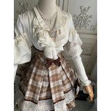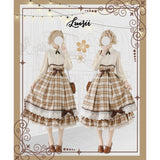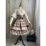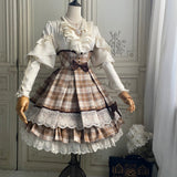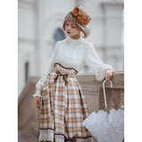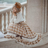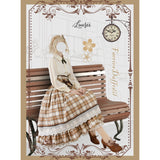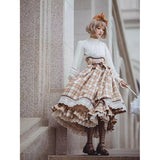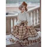 喧騒から少し離れた場所で、自分だけの物語を大切に紡ぐ少女のためのスカート。ブラウンを基調としたチェック柄は、どこか懐かしく、静かな知性を感じさせます。幾重にも重なるレースとフリルは、ページをめくるたびに揺れる時間の層のように繊細で、動くたびにふわりと広がるシルエットは、風に揺れるカーテンや、午後の光が差し込む窓辺の空気を映し出しているかのよう。ウエストに結ばれたリボンや、裾に添えられたレースの装飾は、日常の中にひそむ小さなときめきや、丁寧に過ごされる時間への憧れを象徴し、全体としてどこか物語の中に入り込んだような、静かで優雅な情景を描き出しています。
